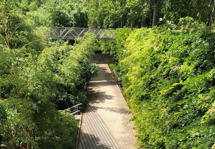 In de afbeelding hieronder heeft de ontwerper een diagonaal in een doorgaand pad geïntroduceerd. Het onderliggende doel zou kunnen zijn om de trap links in het groen te verbinden.