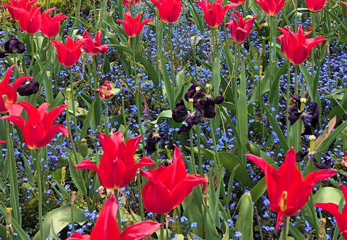 De twee primaire kleuren rood en blauw ‘jutten’ elkaar op. Het rood contrasteert sterk door de blauw-groene context. De tulpen zijn ook hoger. De mengverhouding speelt hierin ook een rol.