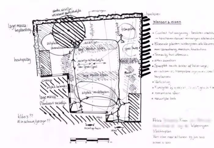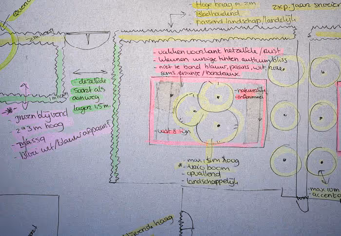 Praten over beplanting is tijdrovend want te gedetailleerd. Zowel jijzelf als de opdrachtgever zijn gebaat bij heldere beelden, de grote lijn. Probeer niet te verzanden in eindeloze opsommingen van soorten, maar probeer het te vangen in een overkoepelend beeld.