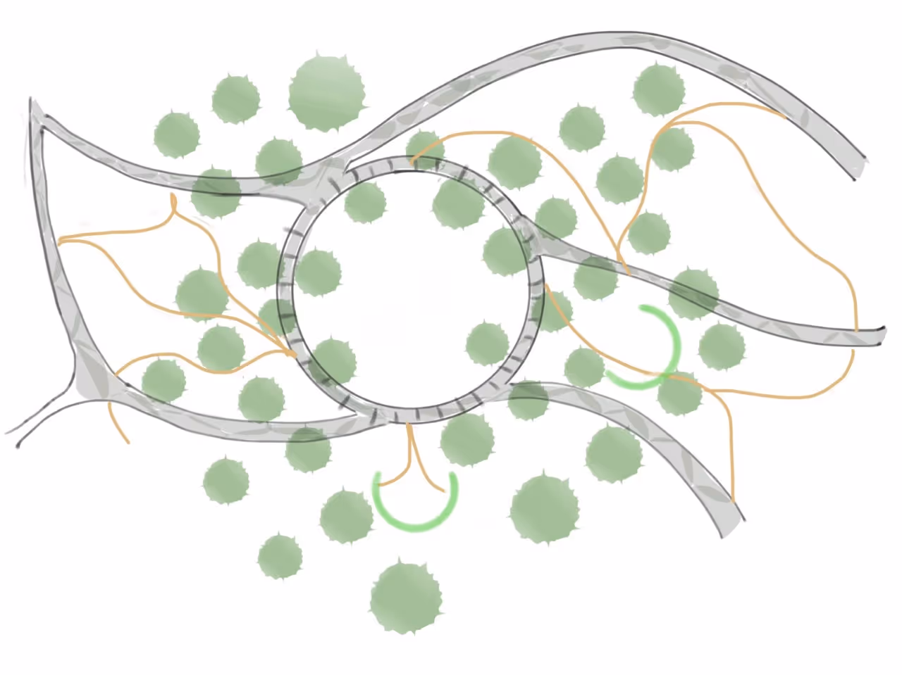 Het Romeinse gedeelte van het park wordt met het hedendaagse gedeelte v met een groene tijdrijs verboden. Werken in context met zicht in de toekomst.