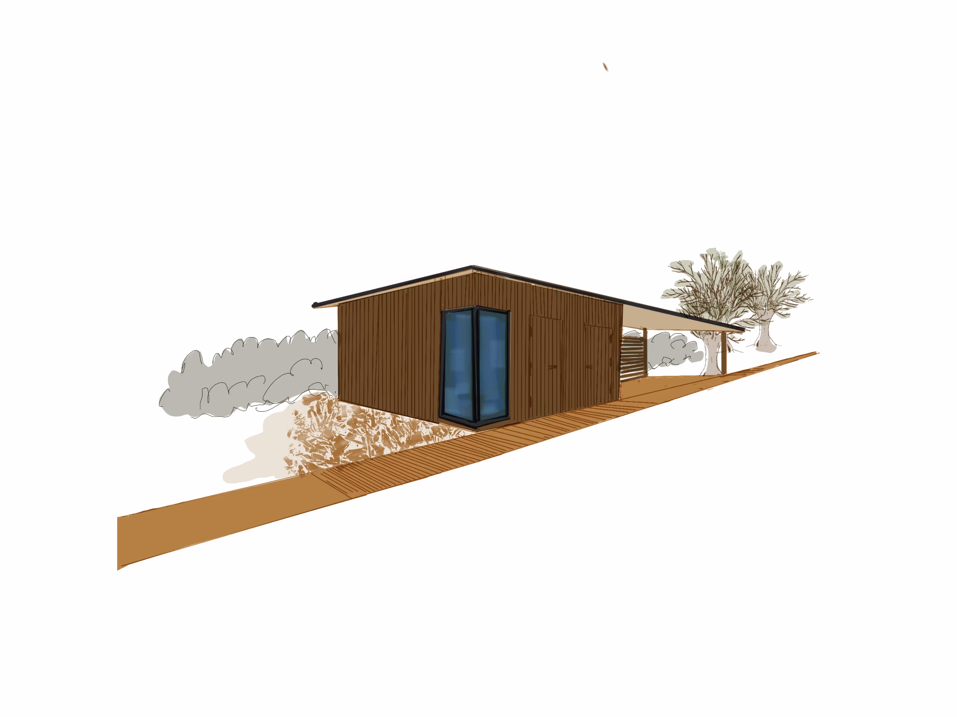 “Als concreet uitgangspunt was er alleen het huis in aanbouw. Met kale grond er omheen. Als je begint met een leeg vlak, zoek je naar aanknopingspunten. Die heb ik gevonden in de hoek van het huis aan de achterkant. De kinderkamer steekt uit en die lijn heb ik doorgetrokken naar achter. Zo ontstond een tweedeling met links de ruimte voor het bijgebouw met schuur en de speeltoestellen voor de kinderen. En rechts van de basis-as meer rust met het grasveld en het terras. Op de tekening zie je een ovaal getekend over het huis. Die vorm gebruik ik om te breken met het rechthoekige, de wat harde structuur van het huis en de voortuin te verbinden met de achtertuin. In het schetsontwerp zie je dat de basis-as een vlonderpad is geworden dat begint met het terras bij de kinderkamer en eindigt met het terras aan het water.”