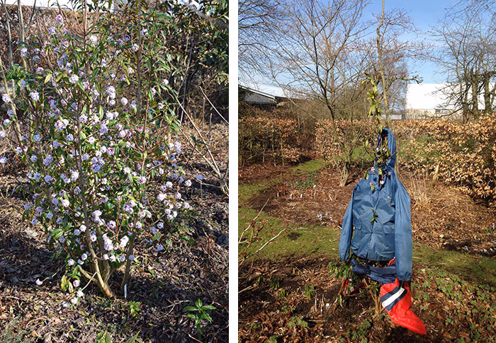 Nou hadden we in 2018 nog een nijdig staartje winter in maart dat ons, trots op onze eyecatcher, toch bezorgd maakten voor bevriezing. Tegen onze principes in hebben we Daphne toen toch – letterlijk en figuurlijk – een jas gegeven om zon en wind van het blad af te houden. Want dat is het geheim van de smid: een wintergroene plant blijft verdampen in tegenstelling tot de bladverliezende heesters. Maar als de wortels in bevroren grond staan, kan er geen vocht opgenomen worden en staat hij gewoon te vriesdrogen. Zorg je dat de wind en/of zon er niet bij kunnen komen, dan krijgt de plant het niet zo voor zijn kiezen.