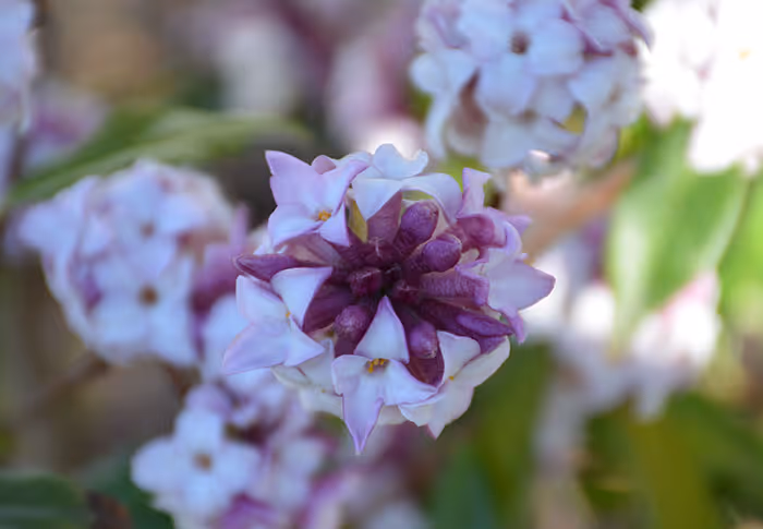Deze Daphne is wintergroen en wordt groter dan D. mezereum, zoals het bekende Peperboompje heet. Uit zaailingen heeft de Engelse veredelaar Postill – in dienst bij de beroemde kwekerij Hillier – er één geselecteerd die beter zijn blad vasthoudt in de winter. De selectie bleek bovendien beter bestand tegen kou en geurde net zo heerlijk als de soort. Reden genoeg voor Mr. Postill om hem op de markt te brengen. En, het privilege bij een eigen gevonden selectie is dat je hem zelf een naam mag geven. Mr. Postill noemde de plant naar zijn vrouw Jacqueline.