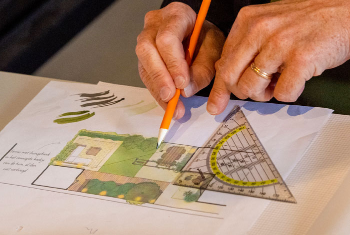 Een goed doordacht ontwerp waarin alles klopt, dat staat voor mij bovenaan bij elke nieuwe ontwerpopdracht. Tijdens het kennismakingsgesprek bespreken we de wensen van de klant en kijken naar de mogelijkheden. Heel vaak komt de klant al met een concrete invulling die – en dat bedoel ik niet lullig – vaak is gebaseerd op wat de buren in de straat ook hebben. Maar als ik precies ga tekenen wat de klant vraagt, krijg je allemaal dezelfde tuinen, terwijl ze juist mij inschakelen voor een goed ontwerp. Voor mij is dat een ontwerp dat past bij de plek, dat aansluit bij de wensen en tegelijkertijd verrast.