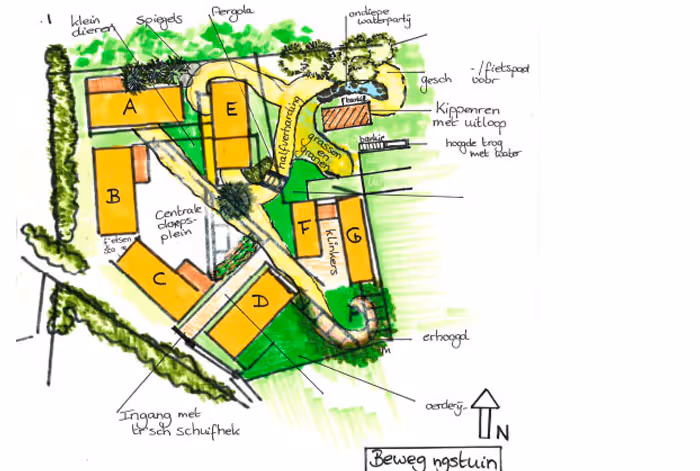 Alexandra vertaalde de huidige indeling in driehoeken naar een nieuw en praktisch ontwerp. Elke driehoek krijgt daarbij een eigen functie waarbij de wensen van de bewoners en hun families heel mooi worden geclusterd. De nieuwe inrichting biedt de bewoners meer mogelijkheden. Zo zijn er verhoogde plantenbakken, geschikt om vanuit een rolstoel te kunnen tuinieren, een grotere volière en kas om bewoners zelf groenten en planten te laten verbouwen, er zijn meer paden zodat alle gebruikers zich ruimer over het terrein kunnen bewegen en dichter bij de dieren kunnen komen. En families krijgen een plek waar ze zich in alle rust kunnen terugtrekken.